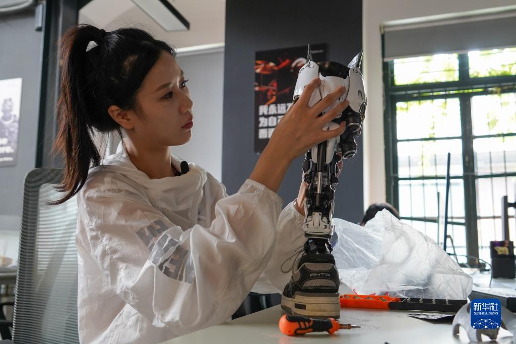 胡月在调试根据自己想法设计的假肢(6月20日摄)。新华社记者 胥冰洁 摄