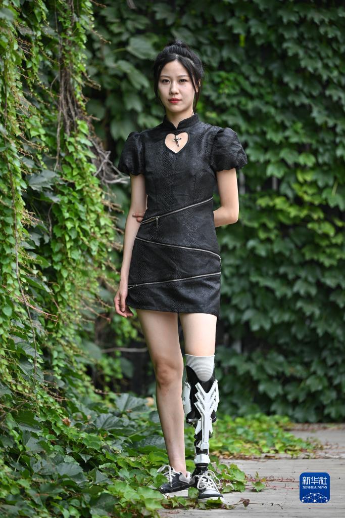胡月穿戴自己设计的假肢留影(6月20日摄)。新华社记者 胥冰洁 摄
