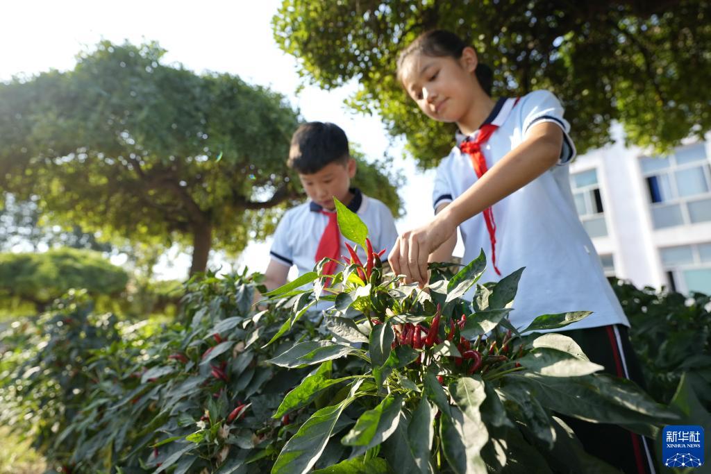 9月13日,河北省乐亭县汀流河小学的学生在“校园农场”内采摘辣椒。