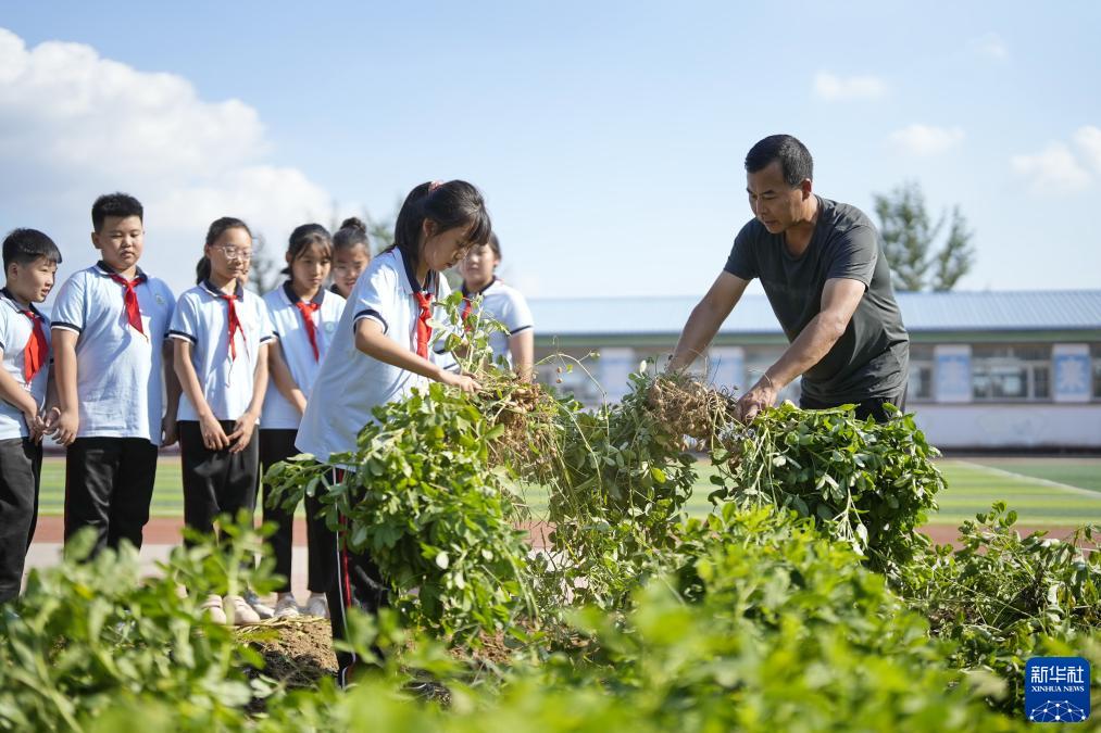 9月13日,河北省乐亭县汀流河小学的老师在“校园农场”内指导学生收获花生。