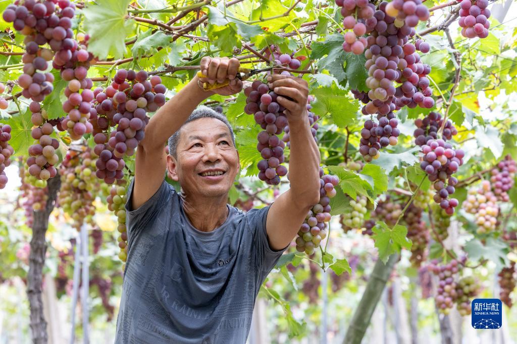 9月13日,浙江省诸暨市安华镇新州村的果农在采摘巨峰葡萄。