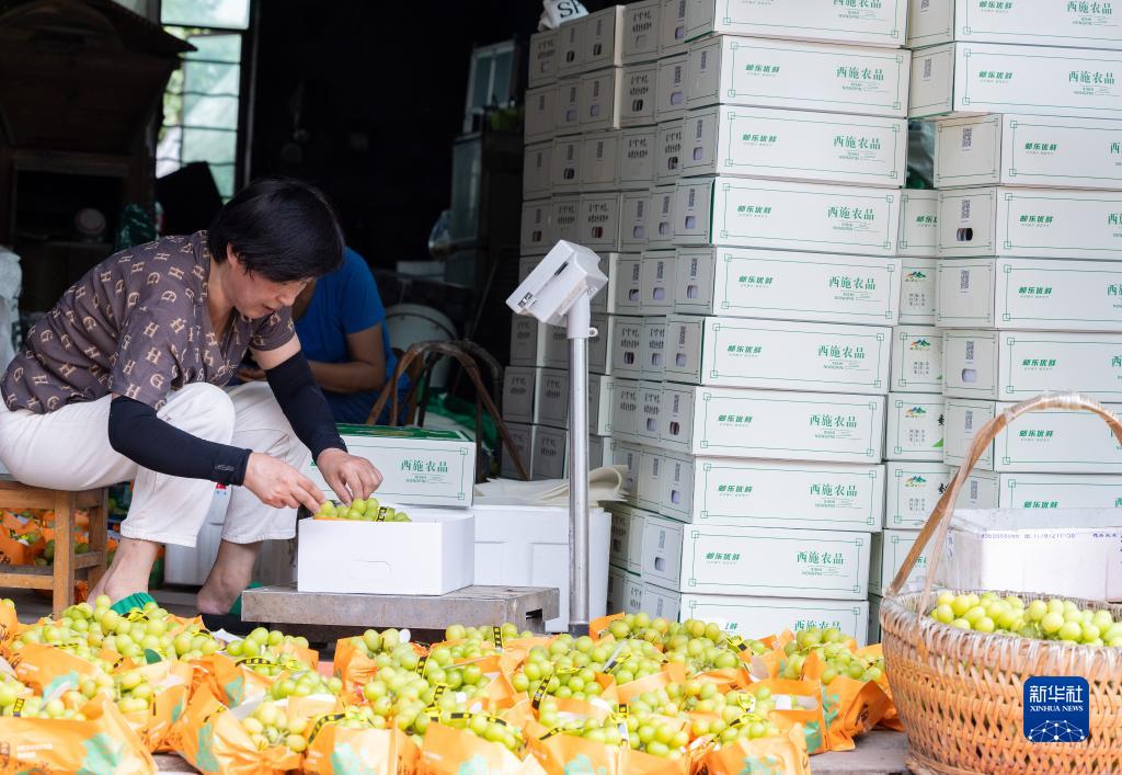 9月13日,浙江省诸暨市安华镇五指山村的果农在给葡萄称重、包装。