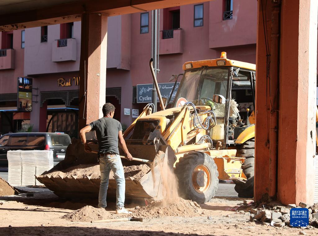 9月13日,工作人员在摩洛哥马拉喀什老城的震后受损建筑旁清理瓦砾。