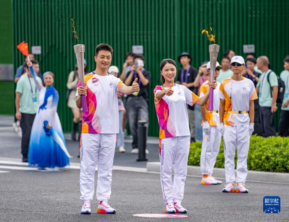 9月14日,火炬手吕义聪(左)和魏梦喜在火炬传递中。