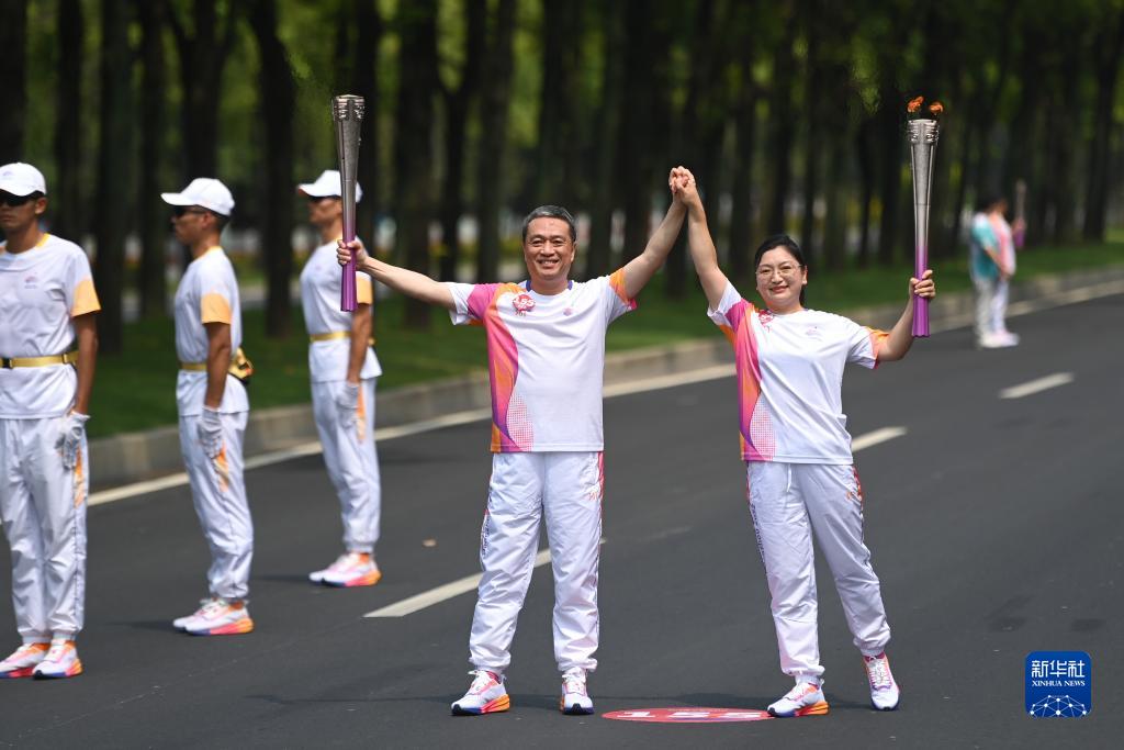 9月14日,火炬手傅群(左)与周秀利在火炬传递中。