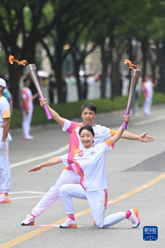 9月14日,火炬手邢艳(前)与陈孝形在火炬传递中。