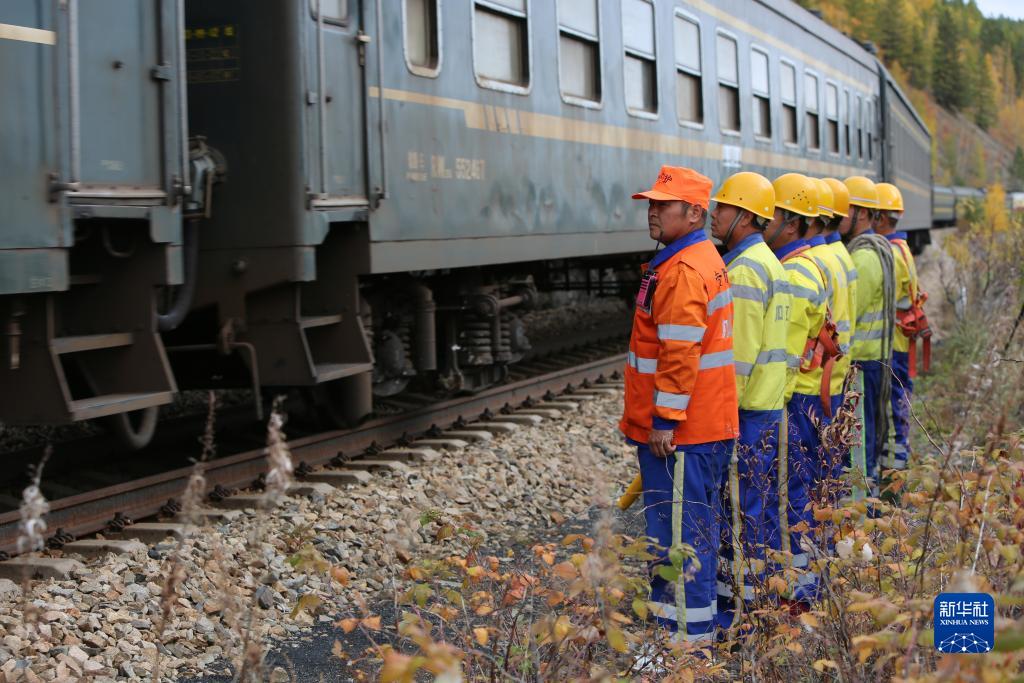 9月13日,中国铁路哈尔滨局集团有限公司加格达奇工务段的铁路工人在大兴安岭地区嫩林线等待火车通过。