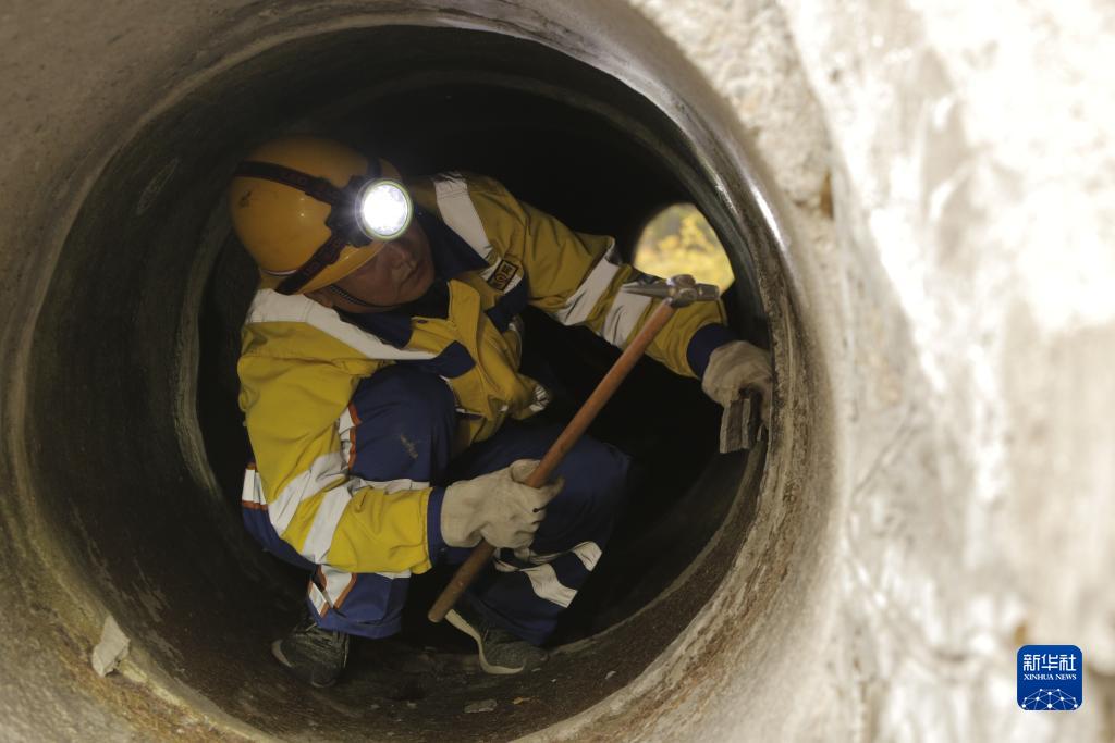 9月13日,中国铁路哈尔滨局集团有限公司加格达奇工务段的铁路工人在大兴安岭地区嫩林线路基涵洞进行设备检查工作。