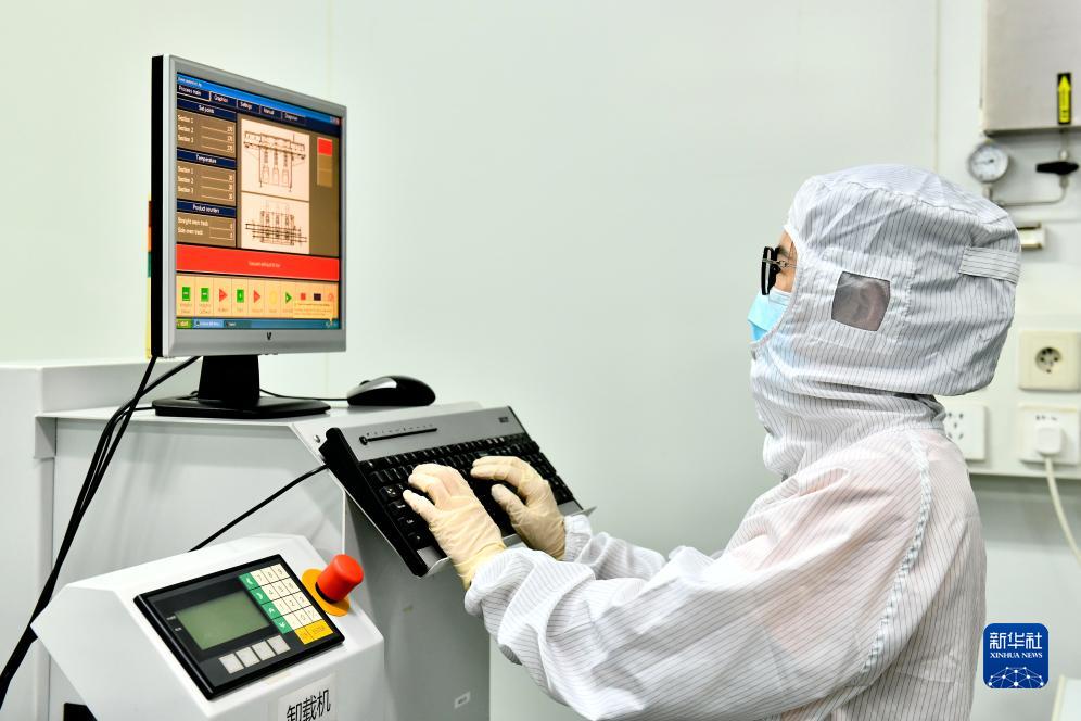 9月13日,在山东昊润自动化技术有限公司压力传感器生产车间,工作人员在设备前值守。
