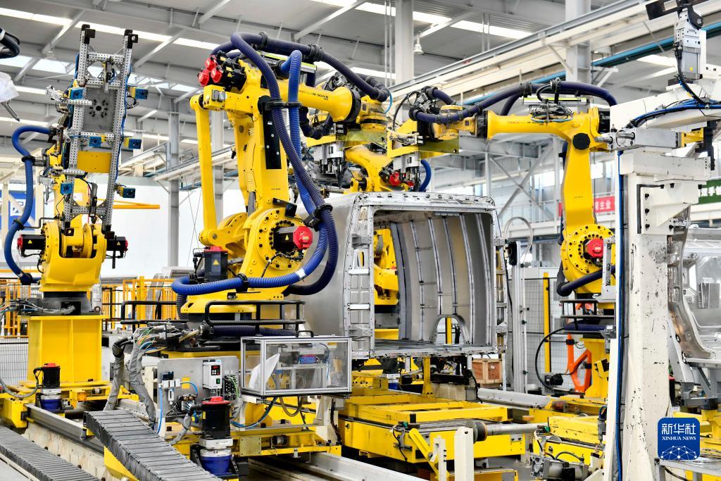 9月13日,在山东邹平魏桥轻量化基地宏奥全铝车身集成生产车间,工业机器人在流水线上作业。