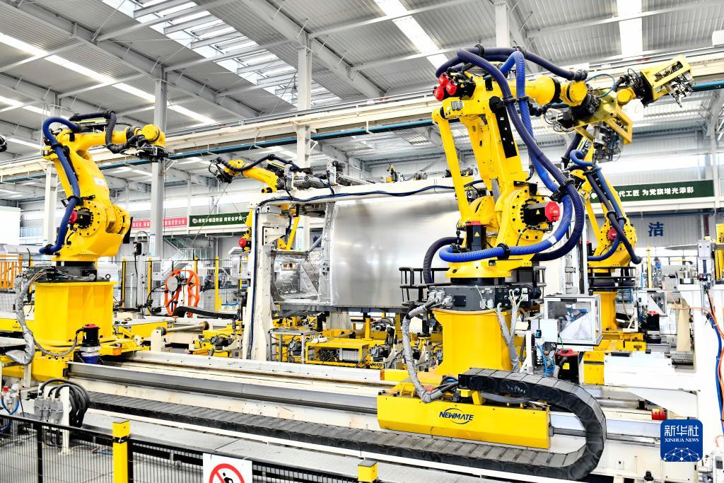 9月13日,在山东邹平魏桥轻量化基地宏奥全铝车身集成生产车间,工业机器人在流水线上作业。