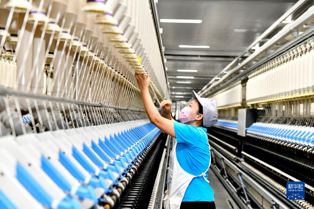 9月13日,在山东宏儒纺织科技有限公司绿色智能化生产车间,工作人员在加工高端纱线。