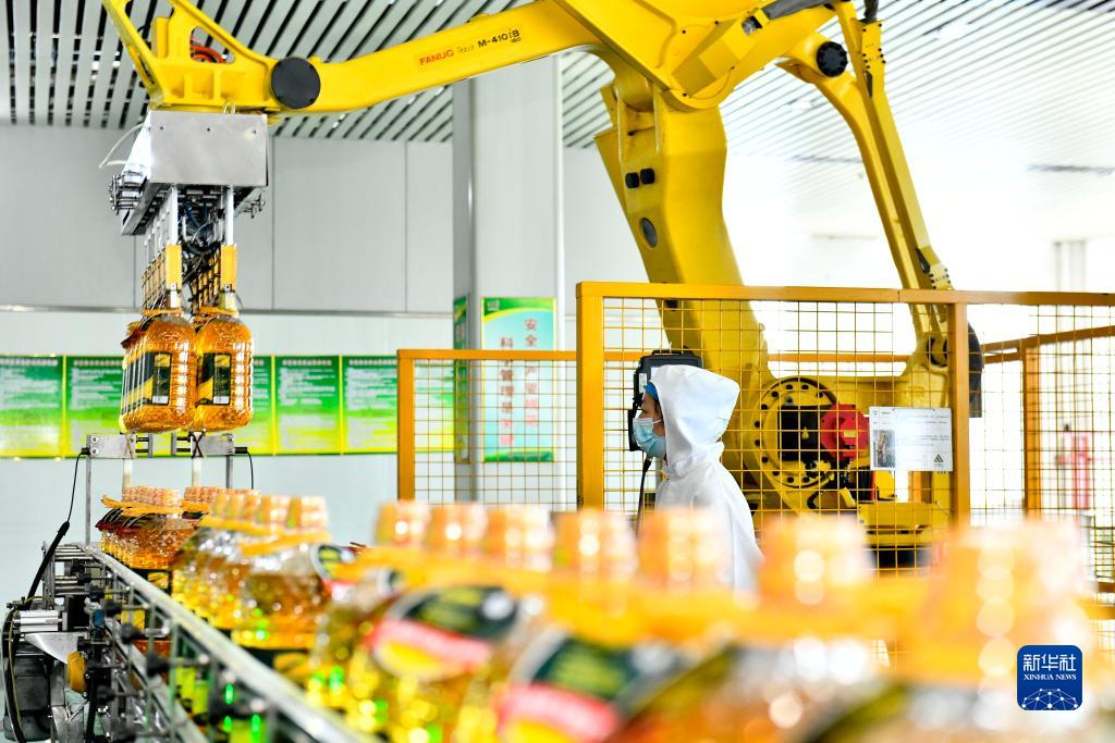 9月13日,在长寿花食品股份有限公司,工业机器人在抓取玉米油。