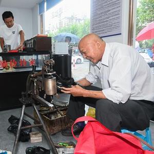 9月14日,修鞋师傅江柏荣(右一)在龙泉街道的社区服务便民小店内,为居民修鞋。