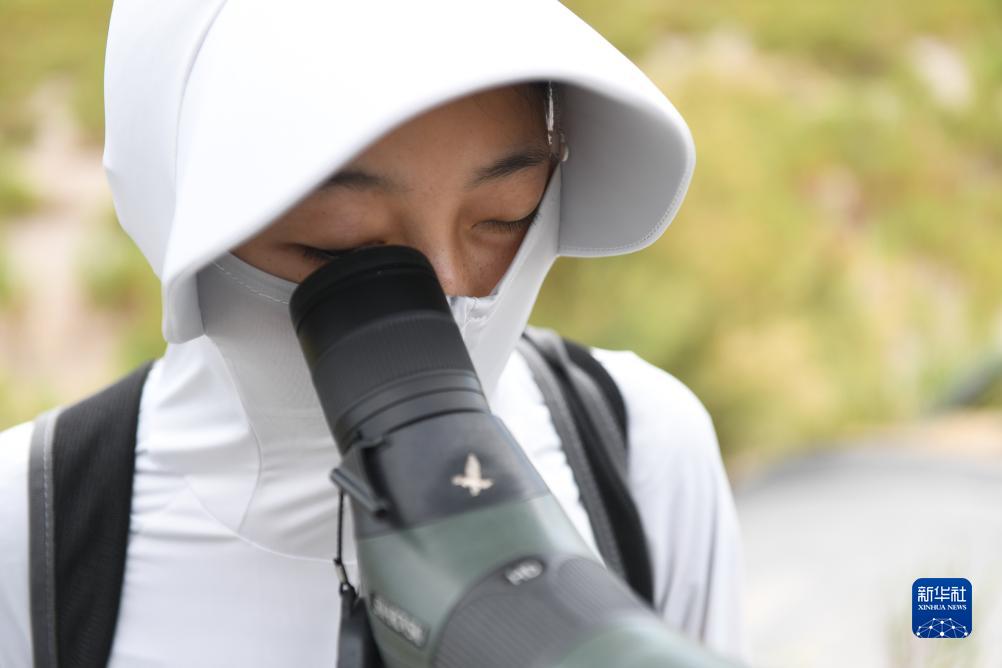 付婷在东台条子泥湿地统计鸟群数量(2023年8月19日摄)。付婷从2020年起加入北京林业大学生态与自然保护学院东亚-澳大利西亚候鸟迁徙研究中心,协助开展条子泥湿地生态与濒危水鸟保护相关研究工作。新华社记者 季春鹏 摄