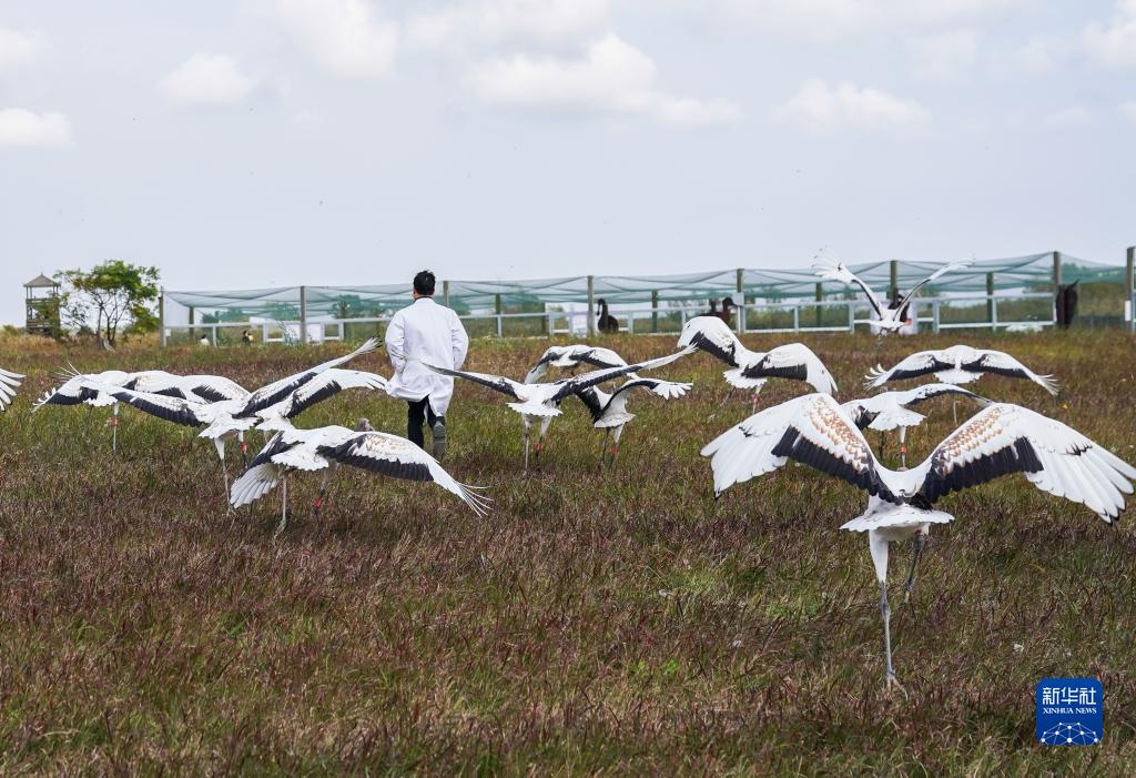 姜官宏对人工繁育的丹顶鹤进行野外放飞训练(2022年11月8日摄)。新华社记者 季春鹏 摄