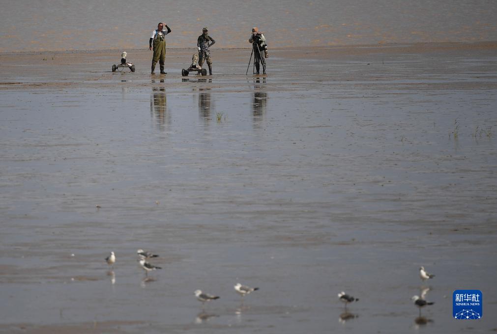 李东明(右一)带领摄影爱好者在条子泥湿地滩涂上拍鸟(2023年8月31日摄)。新华社记者 季春鹏 摄