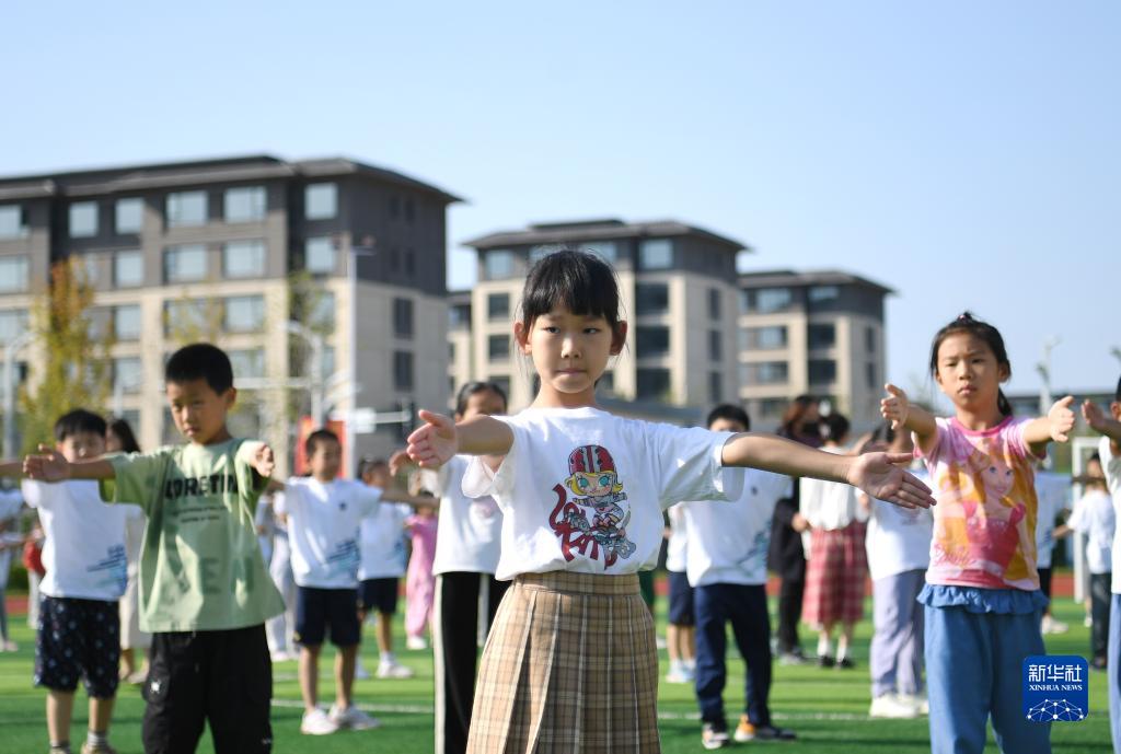 9月13日,雄安史家胡同小学学生在操场上做体操。