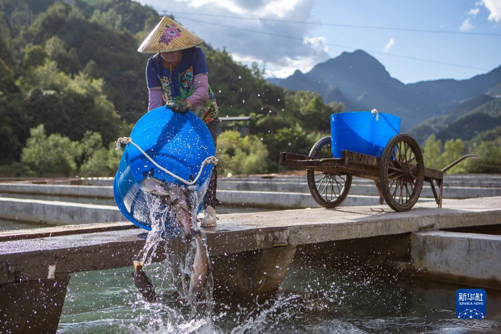 9月13日,在重庆市城口县蓼子乡明安村冷水鱼产业基地,工人对分选的虹鳟鱼进行换池。