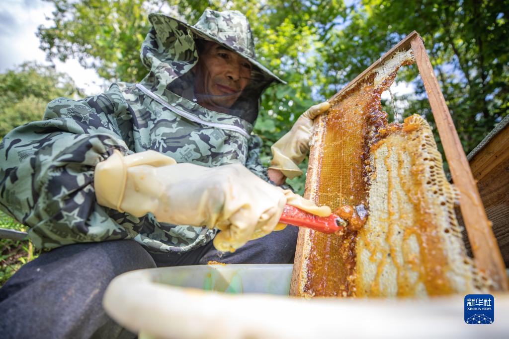 9月13日,在重庆市城口县巴山镇农民村,蜂农在采收蜂蜜。
