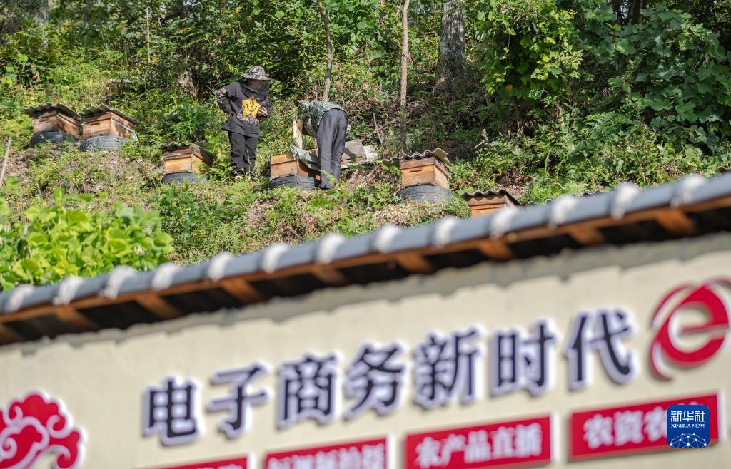 9月13日,在重庆市城口县巴山镇农民村,电商主播喻灵芯(左)在直播蜂农采收蜂蜜。