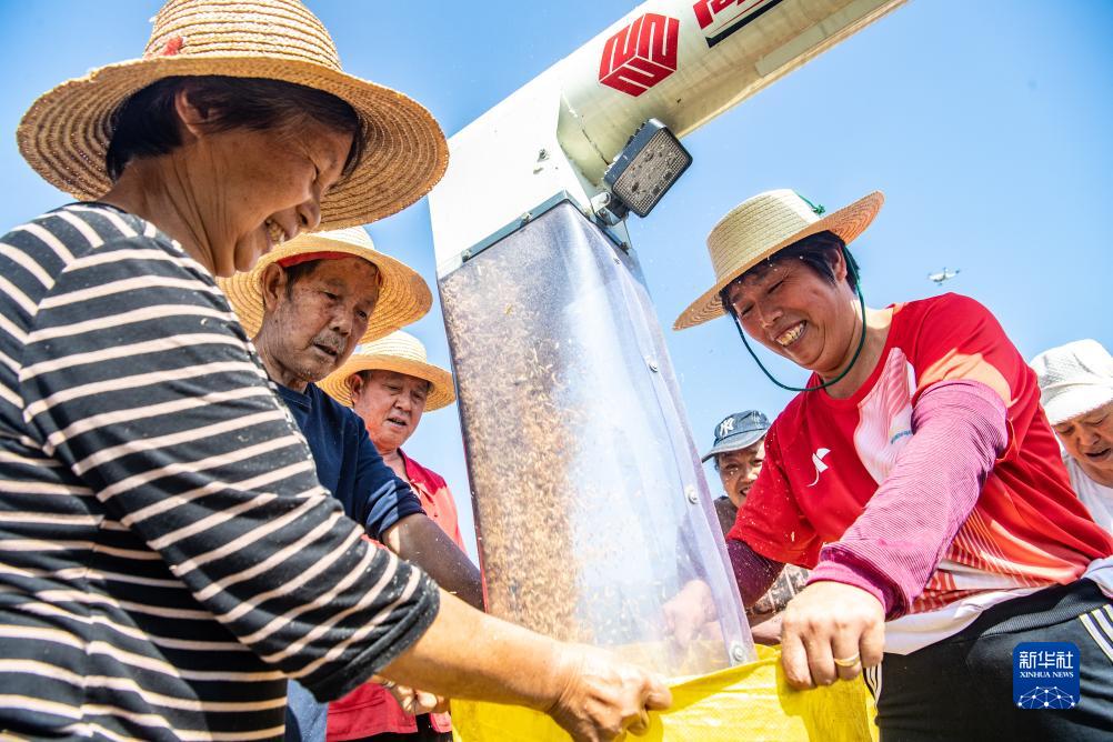 9月14日,稻农在稻田里将刚收割的水稻装袋。