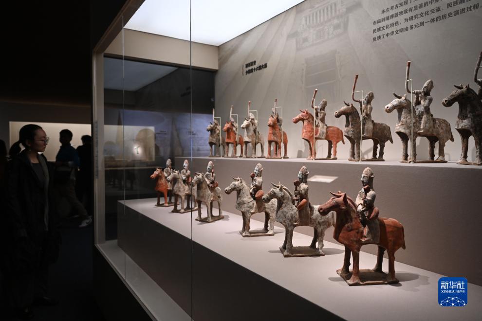 9月14日,观众参观陕西西安少陵原十六国大墓出土的骑马吹角俑和骑马击鼓俑。