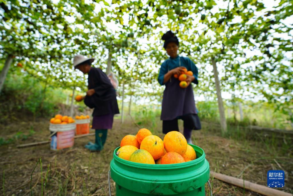 9月14日,村民在贵州省黔东南苗族侗族自治州丹寨县龙泉镇马寨村吊瓜种植基地采收吊瓜。