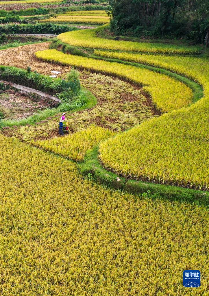 9月14日,村民在贵州省黔东南苗族侗族自治州岑巩县天星乡天星村收获水稻(无人机照片)。