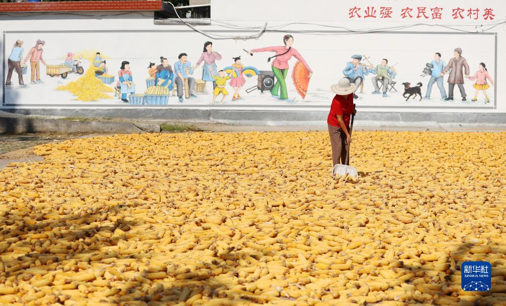 9月14日,山东省临沂市郯城县郯城街道东南村村民在晾晒收获的玉米。