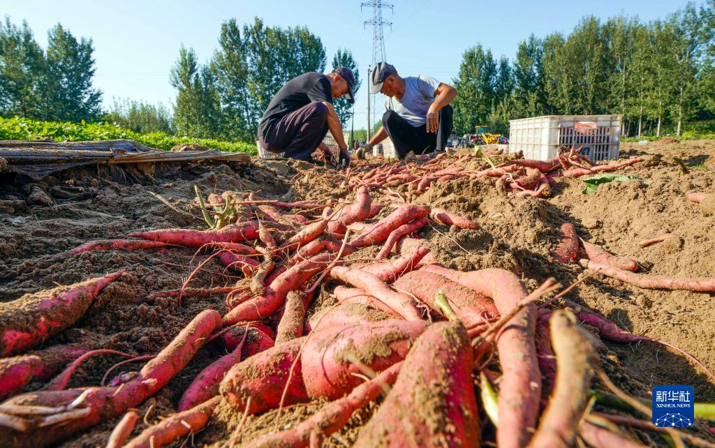 9月14日,河北省唐山市海港经济开发区王滩镇农民在田间收获红薯。
