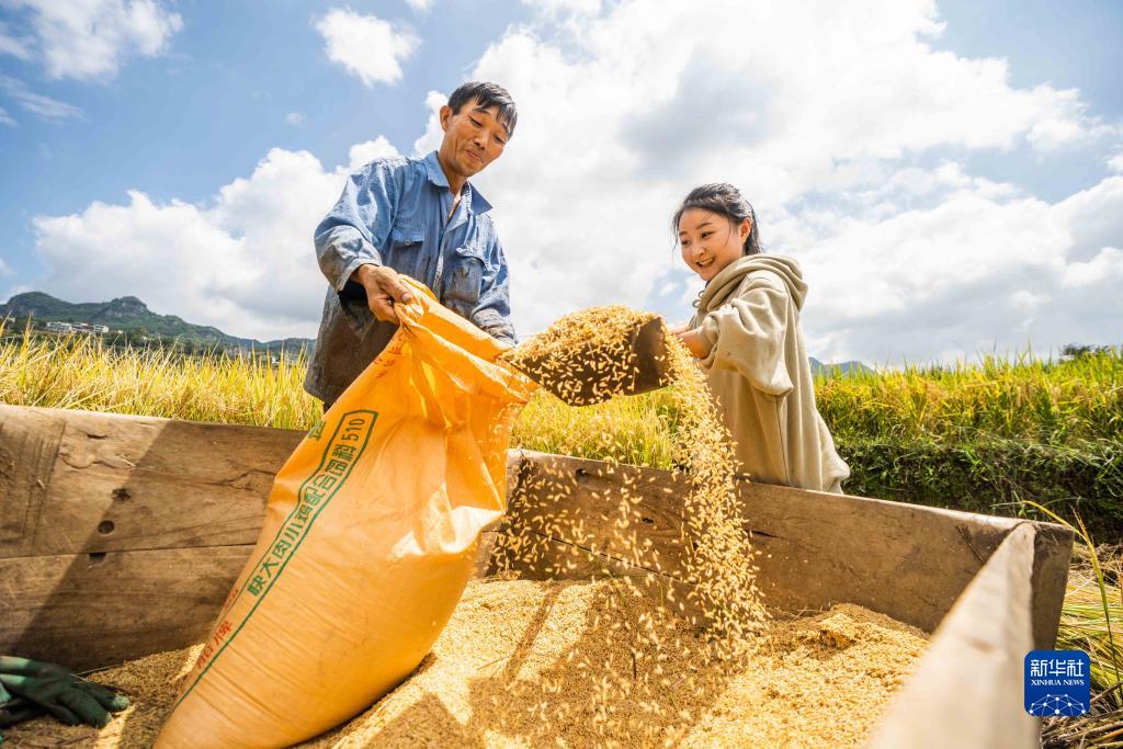 9月14日,村民在贵州省毕节市大方县小屯乡小屯梯田里收集脱粒的稻谷。
