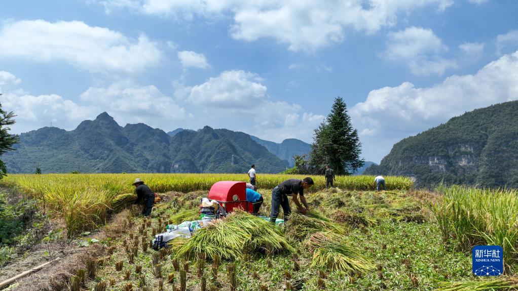 9月14日,重庆市酉阳土家族苗族自治县楠木乡红庄村村民在高山稻田里收割水稻。