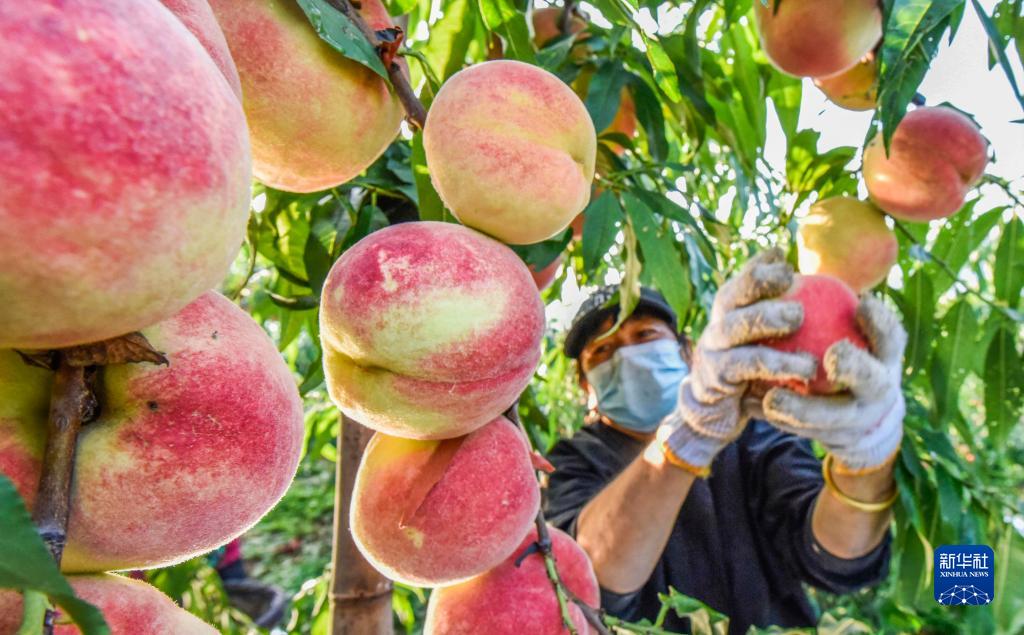 9月11日,河北省遵化市东旧寨镇五虎岭村农民在采摘鲜桃。