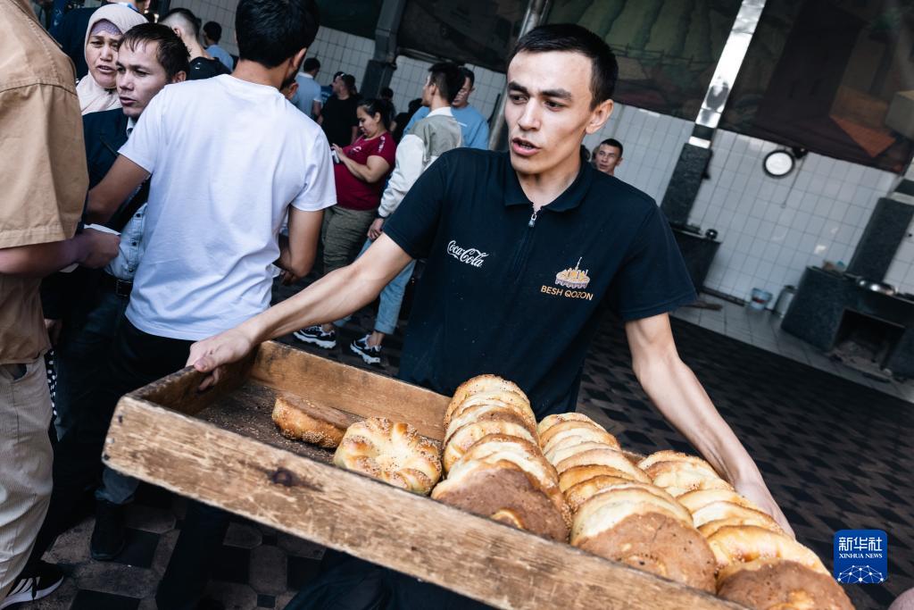 9月14日,在乌兹别克斯坦首都塔什干,工作人员运送面包。