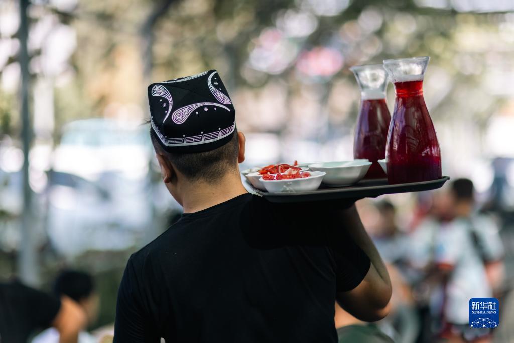 9月14日,在乌兹别克斯坦首都塔什干,工作人员运送石榴汁。