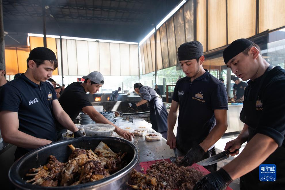 9月14日,在乌兹别克斯坦首都塔什干,工作人员准备制作抓饭的食材。