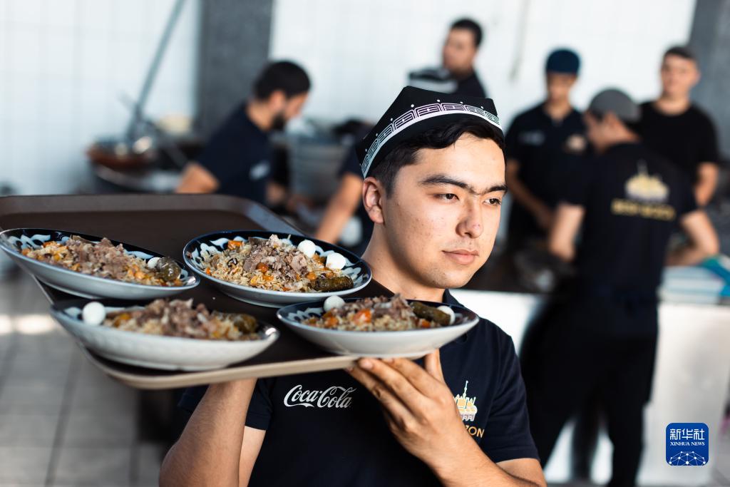 9月14日,在乌兹别克斯坦首都塔什干,工作人员运送抓饭。