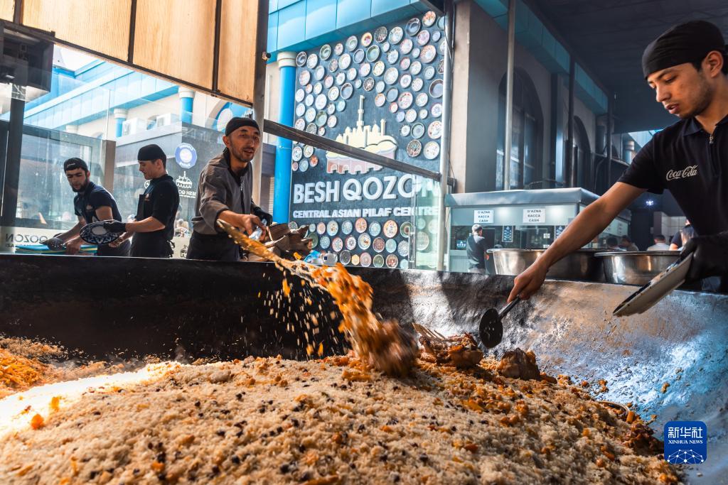 9月14日,在乌兹别克斯坦首都塔什干,中亚抓饭中心主厨(左三)制作抓饭。