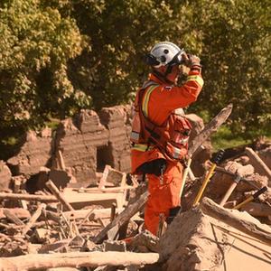 9月14日,救援人员在位于摩洛哥豪兹省的伊姆利勒村的地震废墟上搜救。