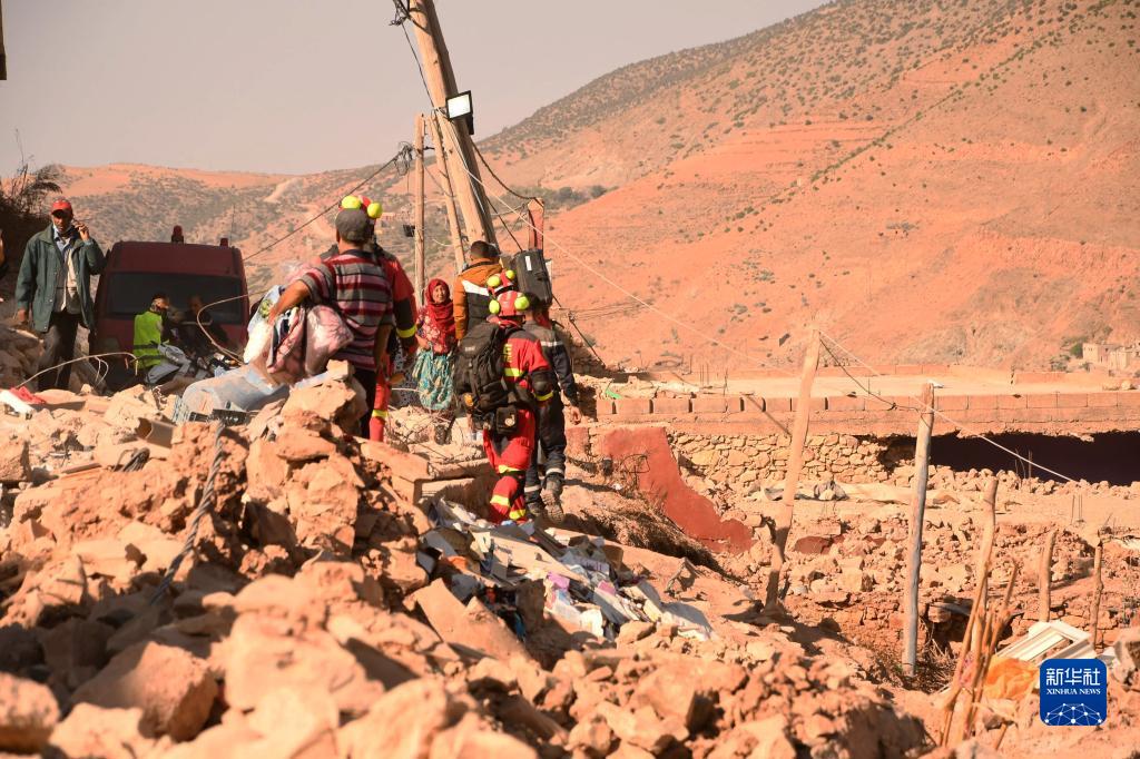 9月14日,救援人员在位于摩洛哥豪兹省的伊姆利勒村的地震废墟上搜救。