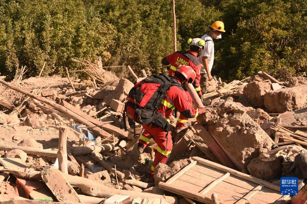 9月14日,救援人员在位于摩洛哥豪兹省的伊姆利勒村的地震废墟上搜救。