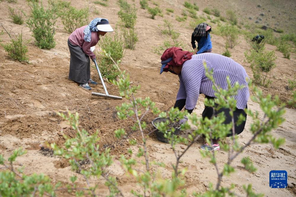 牧民在玛曲县欧拉镇黄河沿岸一处沙化草原治理点补种草籽(7月6日摄)。
