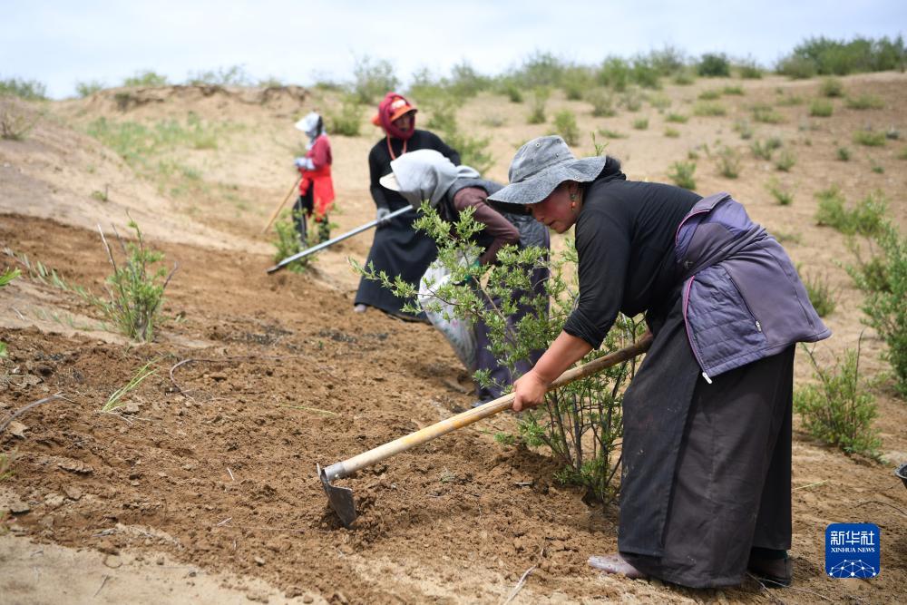 牧民在玛曲县欧拉镇黄河沿岸一处沙化草原治理点补种草籽(7月6日摄)。