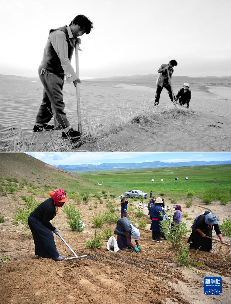 拼版照片:上图为2002年参与防治沙漠化的工作人员在玛曲县黄河沿岸一处沙化草场上压沙(新华社记者韩传号摄);下图为2023年7月6日,牧民在玛曲县黄河沿岸一处沙化草原治理点进行草籽补种工作(新华社记者张可任摄)。