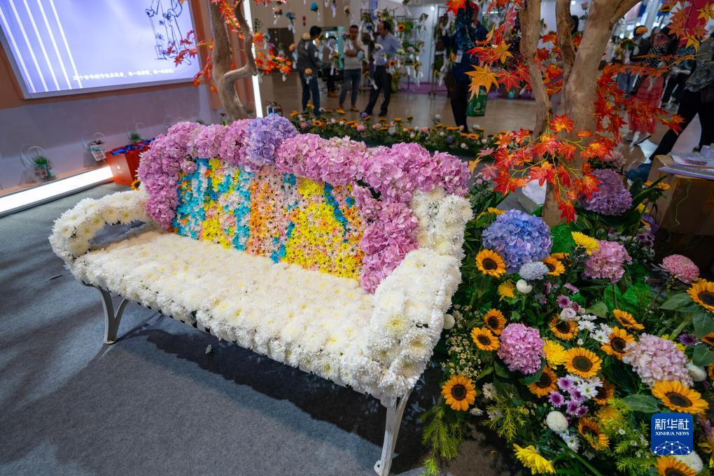这是9月15日在第二十一届中国昆明国际花卉展上拍摄的一张由鲜花装饰的长椅。