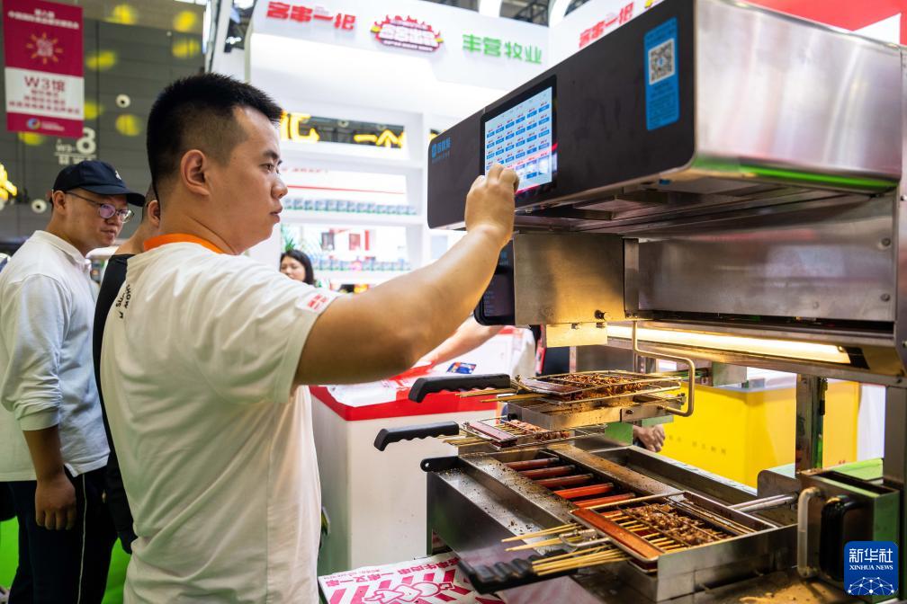 9月15日,在长沙国际会展中心,参展商在展示自动烧烤机操作方法。