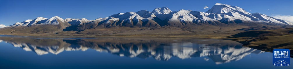 纳木那尼雪山倒映在玛旁雍错湖面上(无人机照片,9月13日摄)。