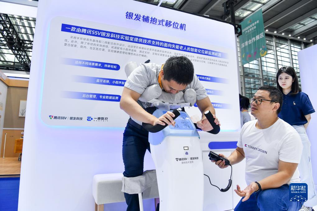 9月15日,观众在深圳智慧养老展上体验失能老人智能化照护产品——银发辅抱式移位机。