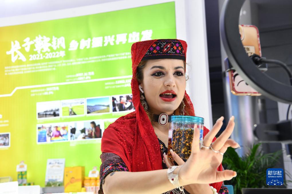 9月15日,在慈展会现场,一名主播正为助农产品直播带货。